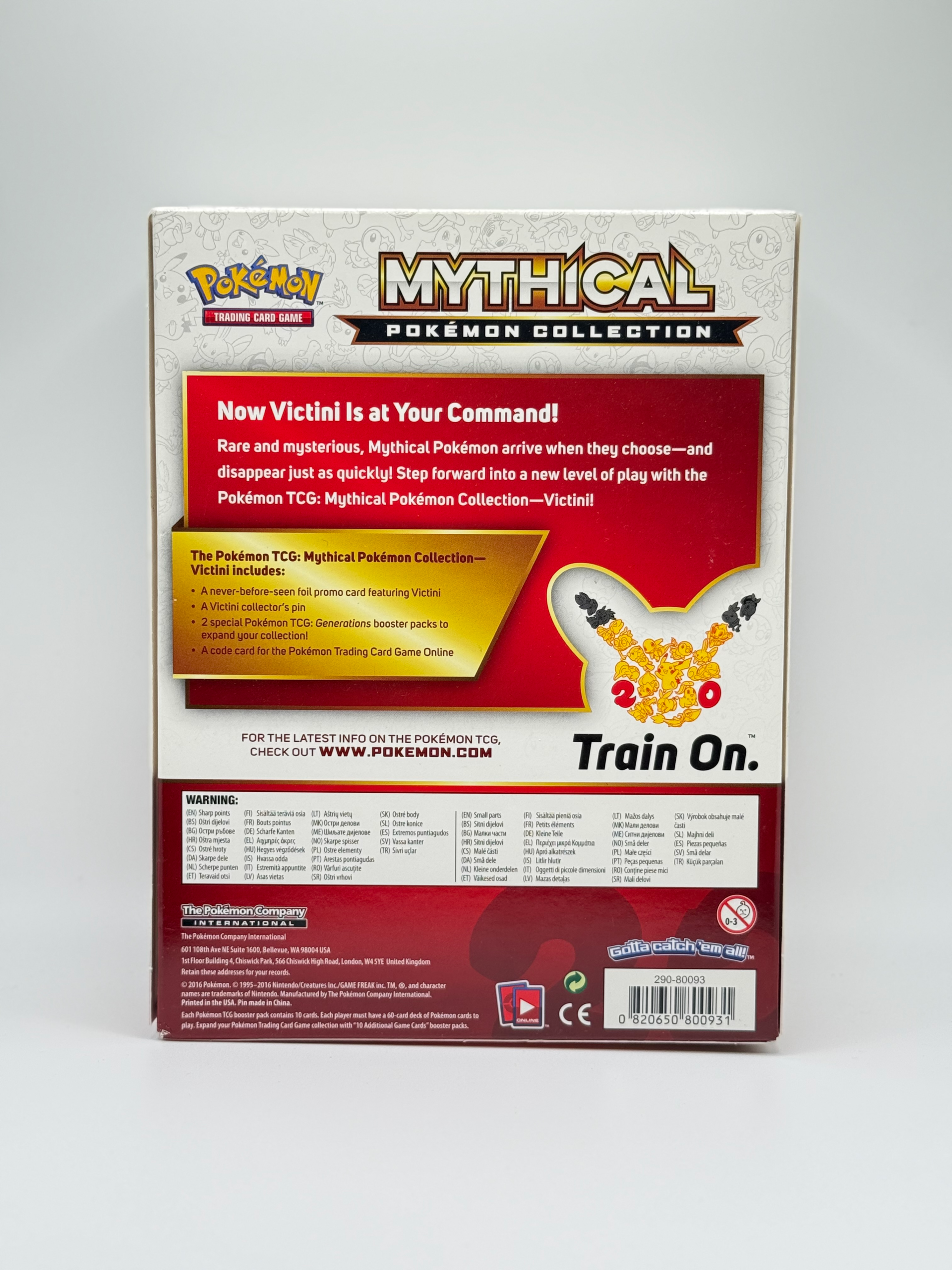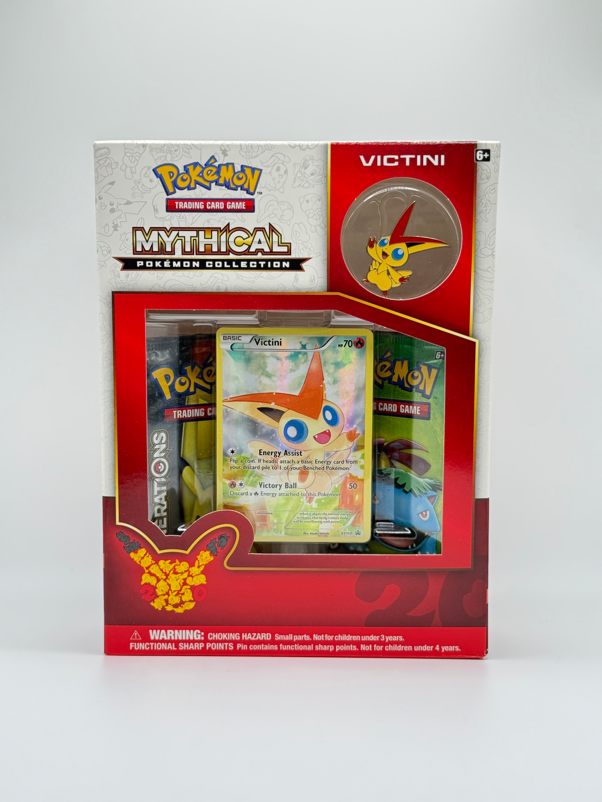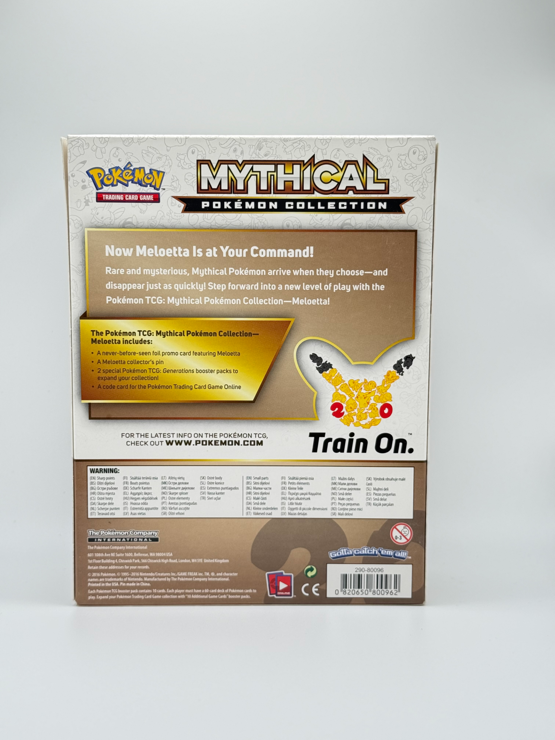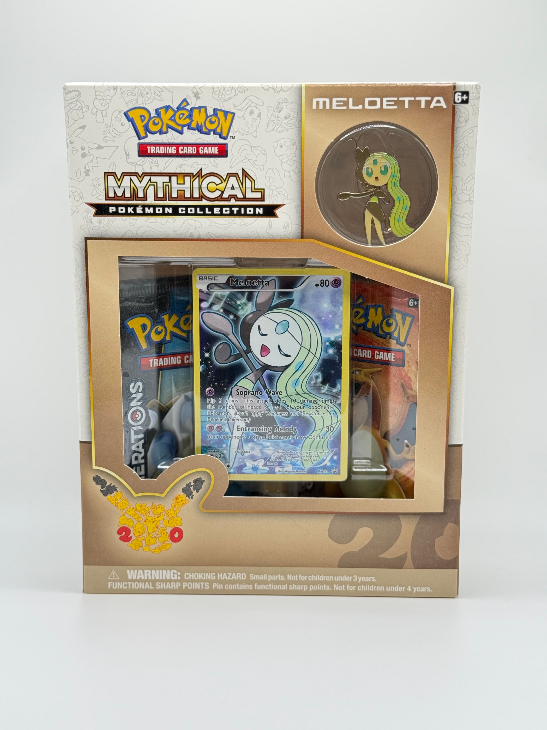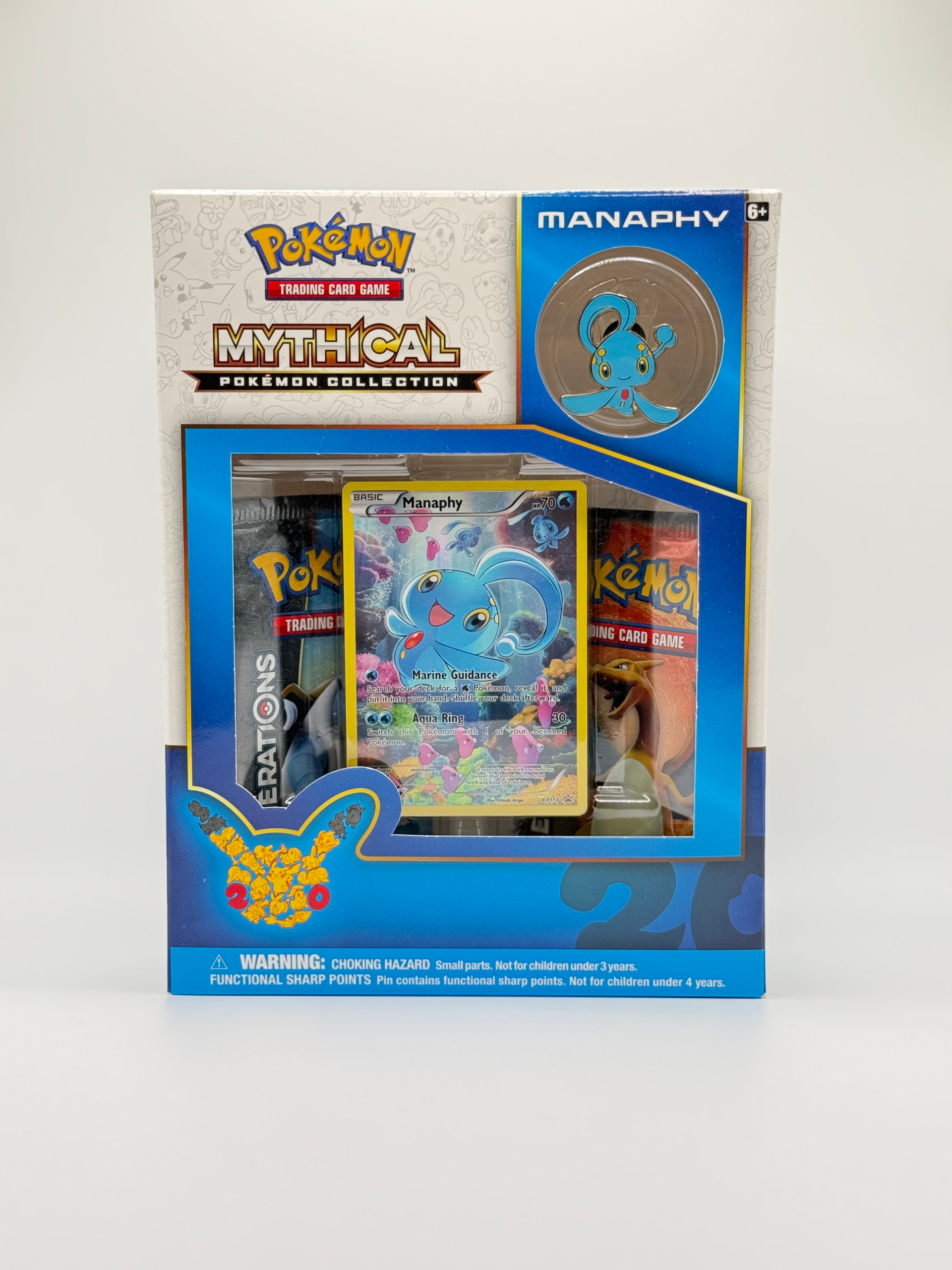 Released throughout Pokémon’s 20th Anniversary celebration in 2016, the Mythical Pokémon Collection features monthly releases dedicated to some of the franchise’s most iconic Mythical Pokémon. Each box includes a stunning full-art Black Star Promo, a collectible enamel pin, and two exclusive Generations booster packs—one of the most celebrated sets of the XY era.