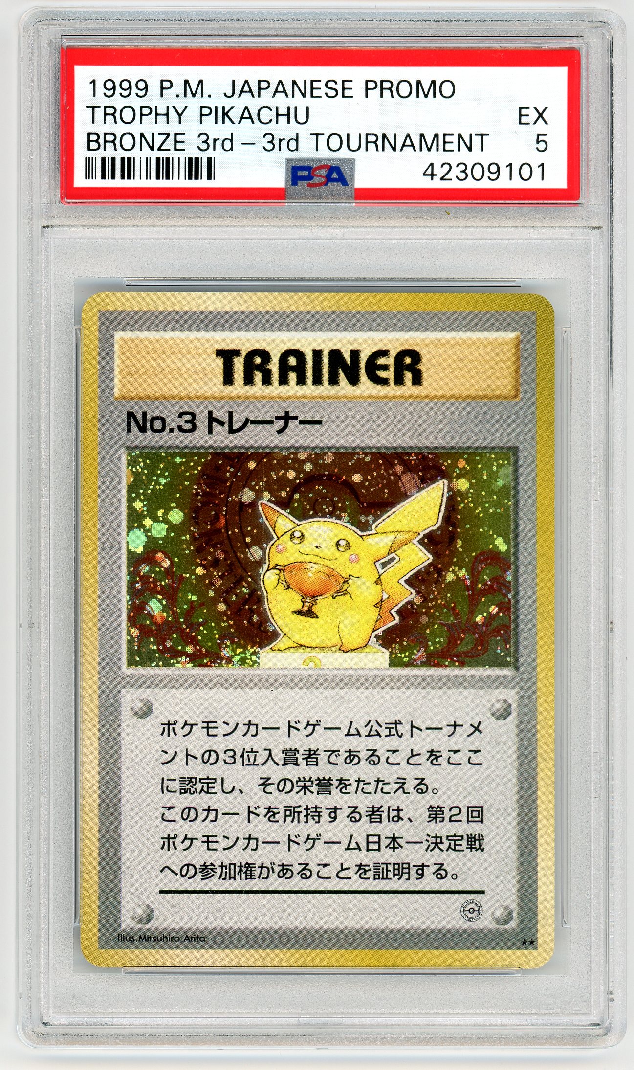This ultra-rare No. 3 Trainer Pikachu Trophy card was awarded to third-place winners at the prestigious 1998 Kamex Mega Battle, officially recognized as the third sanctioned Pokémon Card Game tournament held in Japan. Contrary to the PSA label stating “1999,” this card was definitively issued in late 1998.