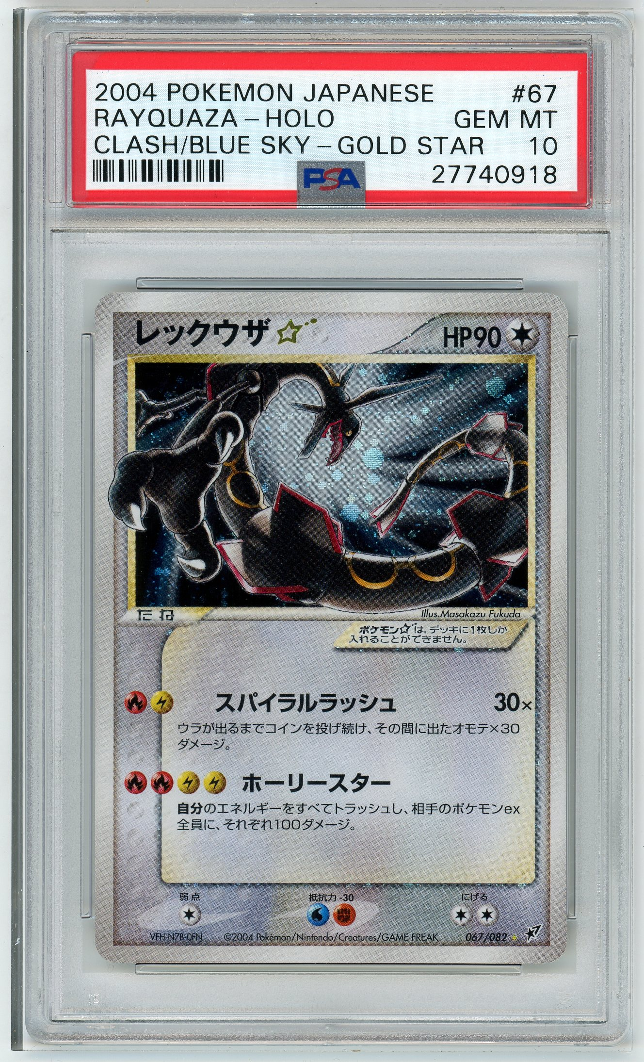 This 2004 Japanese Rayquaza Gold Star from the Clash of the Blue Sky set (the Japanese equivalent of EX Deoxys) features stunning artwork by Masakazu Fukuda, showcasing Rayquaza in its iconic shiny black form.